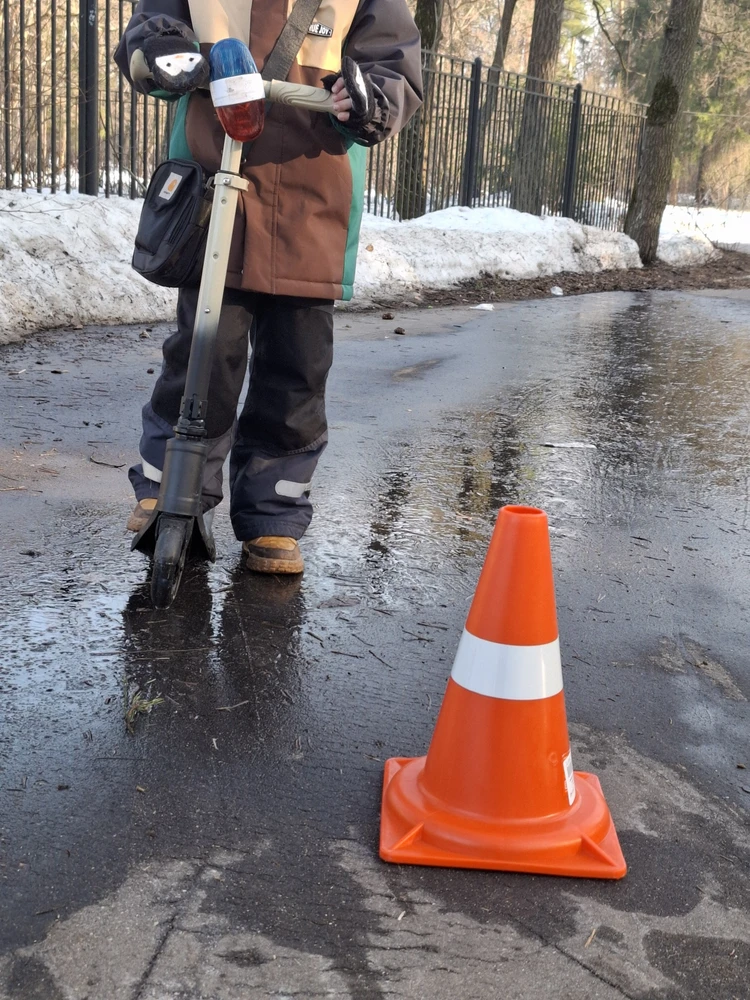 Изготовлены из мягкого пластика, не ломаются при наезде автомобиля. С одной стороны это помогает защитить транспорт от потенциальных царапин на кузове, а с другой, позволяет дольше использовать конусы.