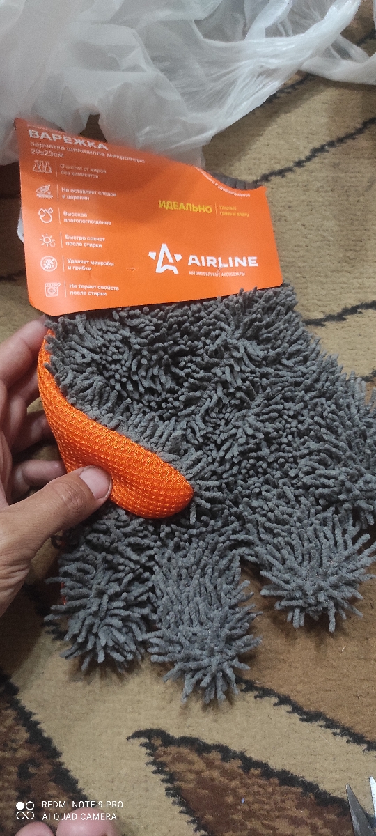 Изделие представляет собой удобную перчатку серо-оранжевого цвета, предназначенную для уборки поверхностей от пыли и различных загрязнений. Ворс перчатки AIRLINE изготовлен из микрофибры, которая не оставляет нитей и разводов на убираемой поверхности, делая ее чистой и блестящей. Также перчатка обладает потрясающими впитывающими свойствами и высокой прочностью.