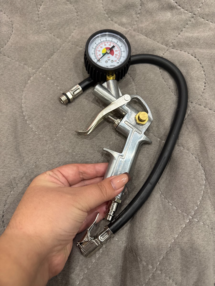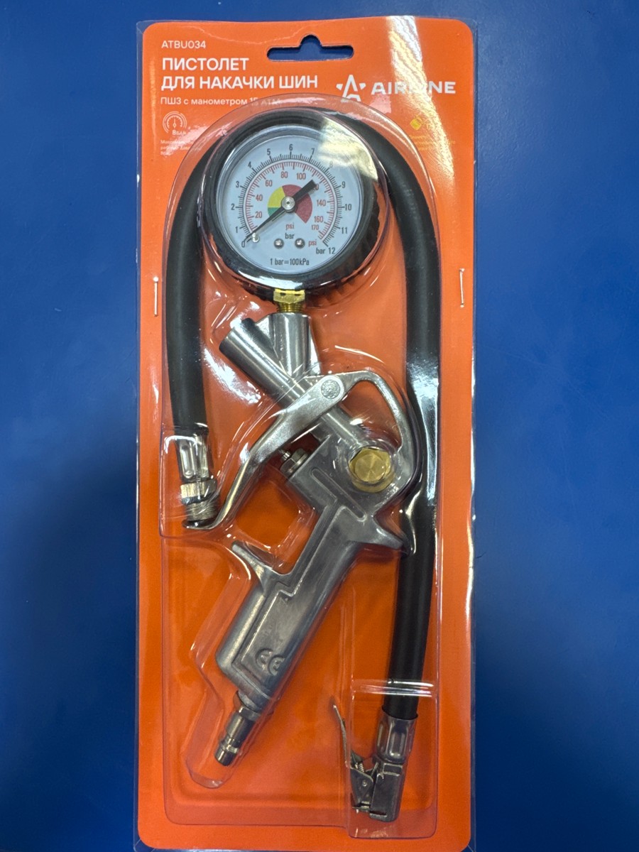 Корпус пистолета изготовлен из алюминиевого сплава. Манометр защищён резиновым чехлом. Гибкий шланг имеет быстросъёмный наконечник. Конструкцией предусмотрена кнопка для сброса лишнего давления. В комплект входит присоединительный фитинг 1/4".