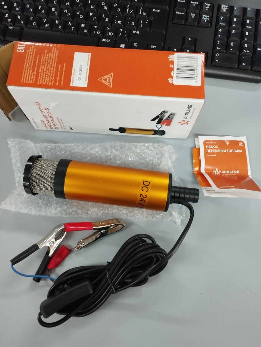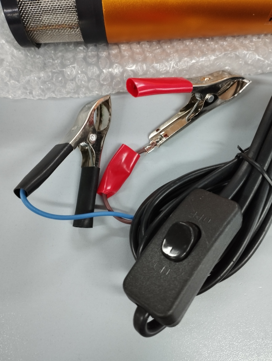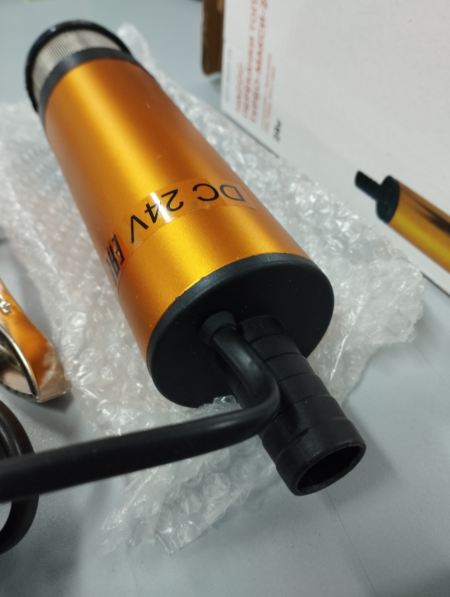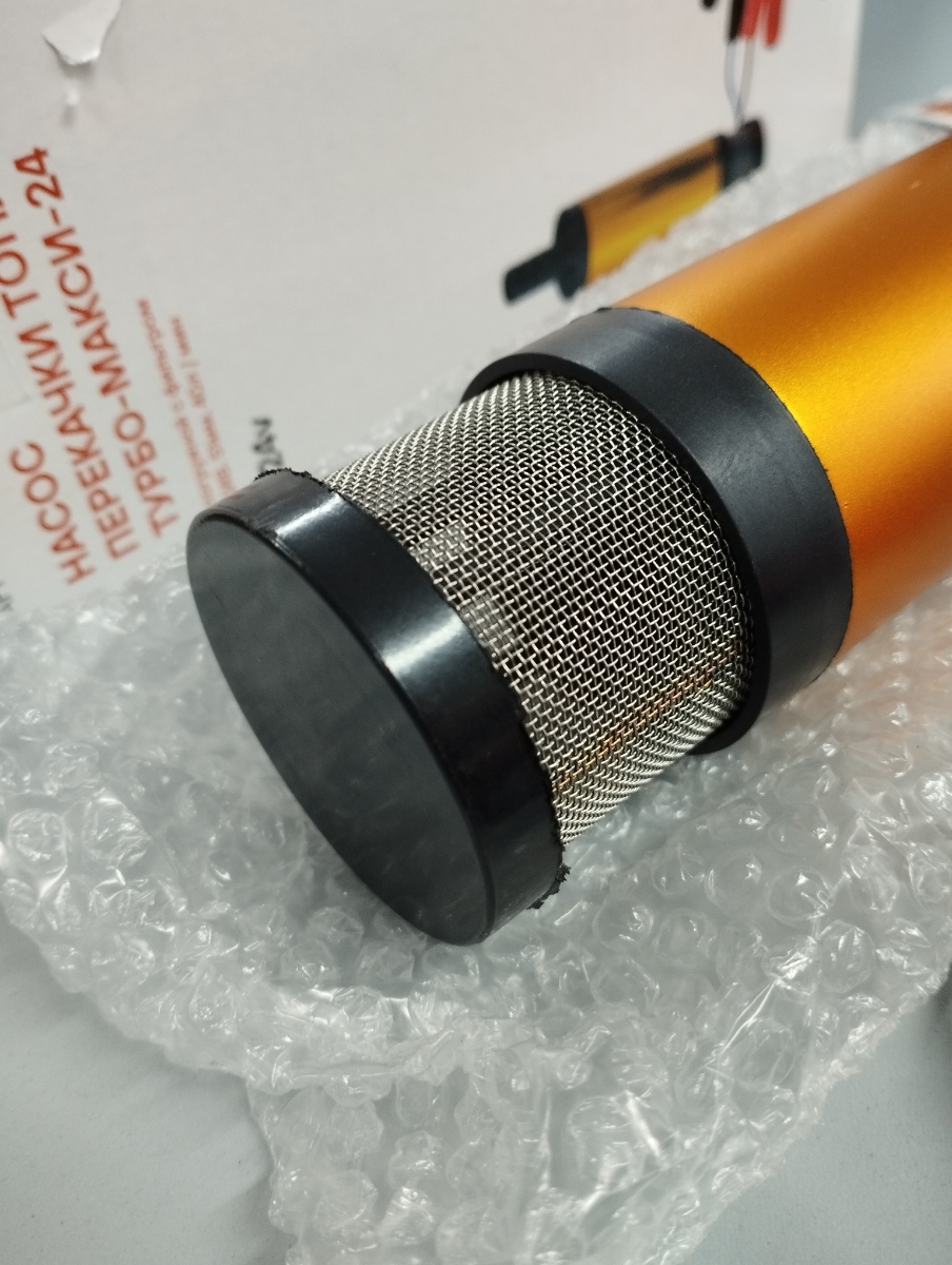 Погружной насос комплектуется выключателем, расположенным на проводе, зажимами типа «крокодил» и металлическим хомутом для обжима шланга. Насос имеет внешний фильтр грубой очистки из нержавеющей стали, благодаря нему в топливный бак автомобиля точно не попадут частицы мусора. Внешний фильтр легко отчищается от мусора и это позволяет продлить срок службы насоса.